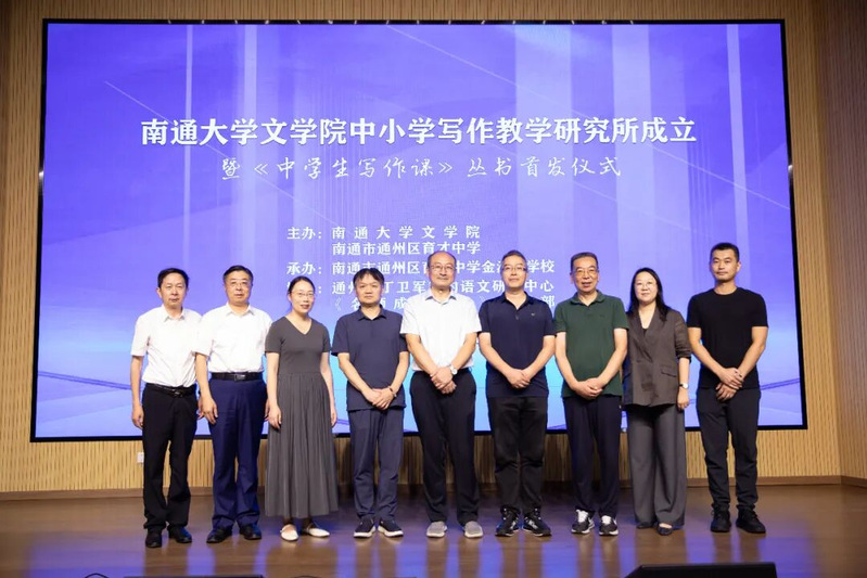 9月18日,必赢bwin线路检测中心中小学写作教学研究所成立暨《中学生写作课》丛书首发仪式在通州区育才中学金沙湾学校顺利举行。《名师成长研究》编辑部主任刘立峰,上海大学必赢bwin线路检测中心与外国语学院双聘教授、中国中小学创意写作联盟理事长谭旭东,通州区教体局二级主任科员胡清华,江苏省特级教师、正高级教师、育才中学党委书记、校长李达,通州区育才中学金沙湾学校校长季晓燕,南通濠滨文化传媒有限公司总经理唐飞,南通市中青年名师丁卫军工作室领衔人、特级教师丁卫军等领导与专家出席了本次活动。仪式由南通市中小学名师培养导师团副团长、通州区中小学名师(校长)培养导师团执行团长、特级教师郭志明主持。